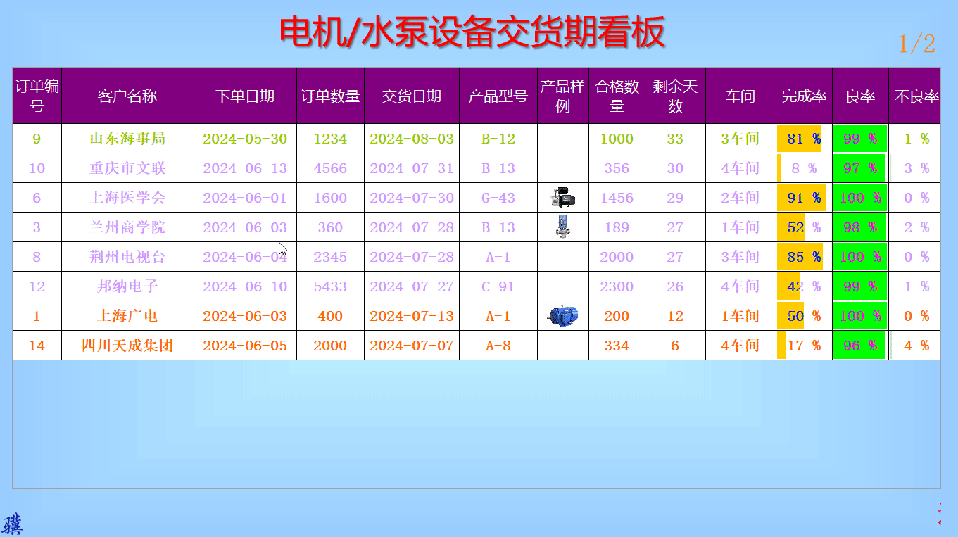 1、适用于生产企业、车间动态显示生产订单的客户信息、订货信息、生产进度/质量等信息,供生产管理者掌握实时情况。